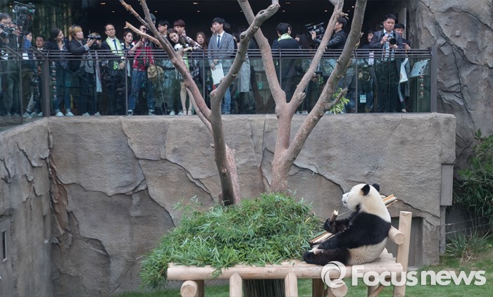 (용인=포커스뉴스) 21일 오전 경기도 용인시 에버랜드에서 열린 '판다월드 개관식'에서 미쓰에이 수지를 비롯한 참석자들이 팬더를 구경하고 있다.