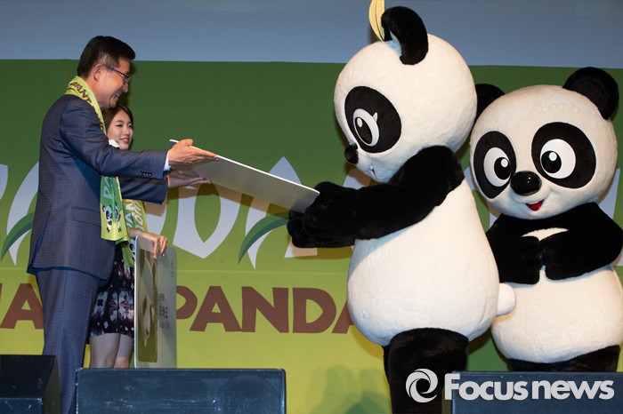 (용인=포커스뉴스) 21일 오전 경기도 용인시 에버랜드에서 열린 '판다월드 개관식'에서 김봉영 삼성물산 대표이사 사장이 아이바오 팬더 캐릭터 인형에게 명예 사원증을 전달하고 있다.