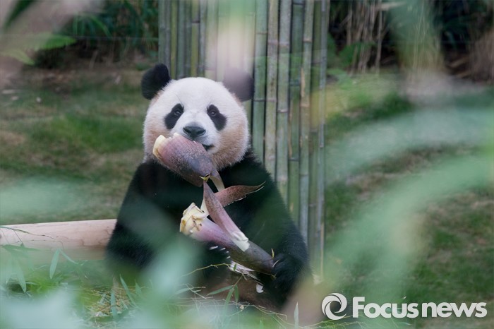 (용인=포커스뉴스) 21일 오전 경기도 용인시 에버랜드에서 열린 '판다월드 개관식'에서 아이바오가 먹이를 먹고 있다.