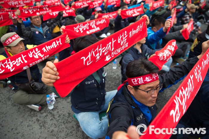(서울=포커스뉴스) 21일 오후 서울역 앞에서 민주노총 전국건설노동조합 전국의 간부들이 건설노조 확대간부 결의대회를 열고 건설민생법안 통과를 촉구하는 집회를 하고 있다.
