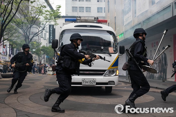 (서울=포커스뉴스) 21일 오후 서울 중구 명동예술극장에서 경찰특공대, 중부소방서, 218연대 등이 공연장 대테러훈련을 실시하고 있다.