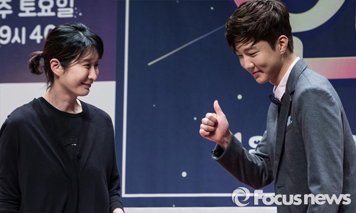 (서울=포커스뉴스) 21일 오후 서울 마포구 JTBC 사옥에서 열린 예능프로그램 '반달친구' 제작발표회에 참석한 아이돌 그룹 위너의 멤버 이승훈(오른쪽)이 김수아 PD에게 인사를 하고 있다.
