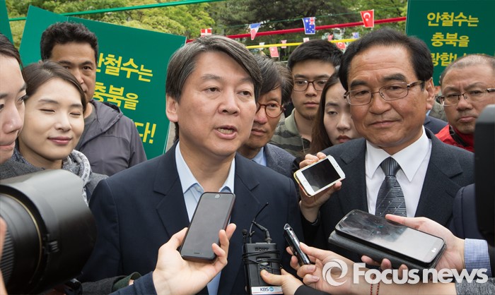 (청주=포커스뉴스) 안철수 국민의당 상임공동대표가 21일 오후 충북 청주 상당구 성안길과 중앙공원을 찾아 시민들과 인사를 마치고 취재진의 질문에 답변하고 있다. 안 대표는 4.13 국회의원선거에서 국민의당을 지지해준 것에 대한 감사의 뜻을 전했다.