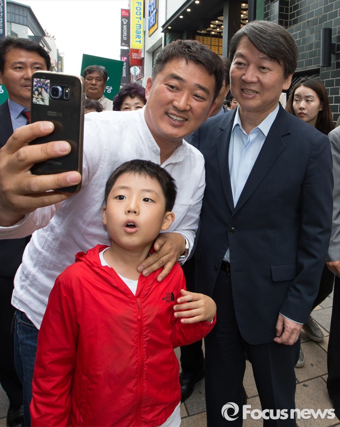 (청주=포커스뉴스) 안철수 국민의당 상임공동대표가 21일 오후 충북 청주 상당구 성안길을 찾아 시민들과 셀카를 촬영하고 있다. 안 대표는 4.13 국회의원선거에서 국민의당을 지지해준 것에 대한 감사의 뜻을 전했다.