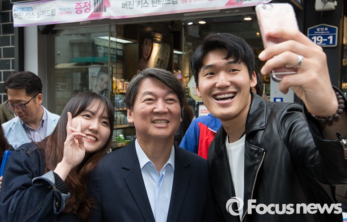 (청주=포커스뉴스) 안철수 국민의당 상임공동대표가 21일 오후 충북 청주 상당구 성안길을 찾아 시민들과 셀카를 촬영하고 있다. 안 대표는 4.13 국회의원선거에서 국민의당을 지지해준 것에 대한 감사의 뜻을 전했다.