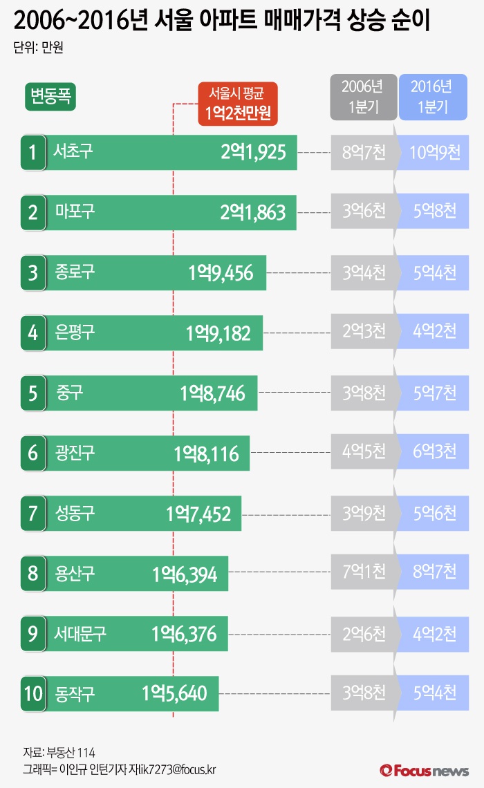 [그래픽] 2006~2016년 아파느 매매가격 상승 순이