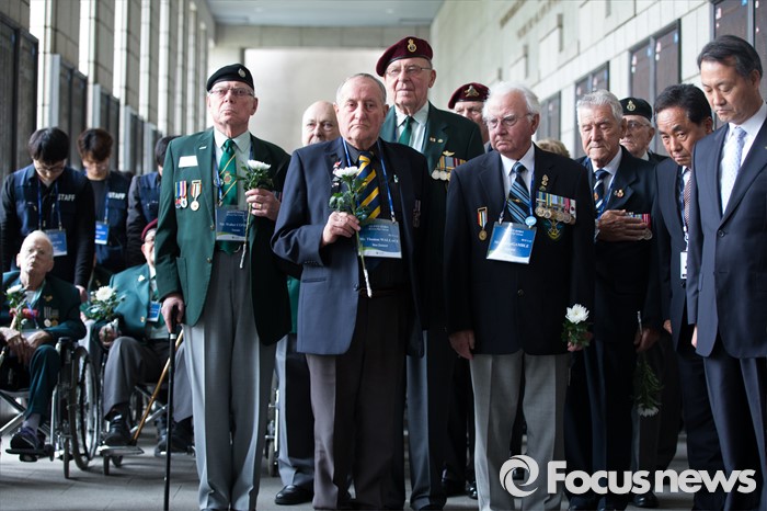 (서울=포커스뉴스) 임진강 및 가평전투 65주년을 맞은 21일 오후 서울 용산구 전쟁기념관에서 6.25전쟁에 참전했던 영연방(영국, 캐나다, 호주, 뉴질랜드) 참전용사들이 묵념을 하고 있다.