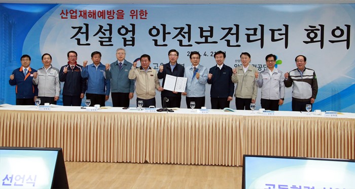 (서울=포커스뉴스) 이기권 고용노동부장관이 21일 오전 서울 송차구 잠실 제2롯제월드 120층 신축공사 건물에서 50대 건설업체 CEO가 참석하는 건설업 안전보건리더 회의에서 '재해예방 공동협력 선언문'을 채택후 기념촬영을 하고 있다. <사진제공=고용노동부>