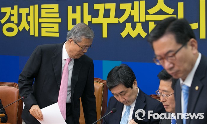 (서울=포커스뉴스) 22일 오전 서울 여의도 국회에서 더불어민주당 비상대책위원회의를 마친 김종인 비대위 대표 등 의원들이 퇴장하고 있다. 왼쪽부터 김 대표, 이종걸 원내대표, 양승조, 정성호 비대위원.