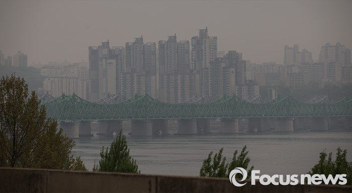 (서울=포커스뉴스) 기상청에서 밤부터 황사가 시작될 것으로 예상한 지구의 날인 22일 오전, 서울 한강철교 북단에서 안개와 먼지 낀 도심이 보이고 있다.