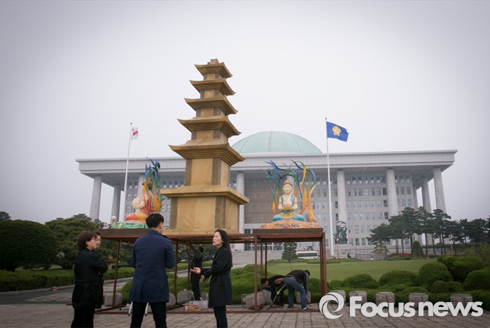 (서울=포커스뉴스) 석가탄신일을 3주 가량 앞둔 22일 오후 서울 여의도 국회 본청 앞 분수광장에 연등이 설치되어 있다.