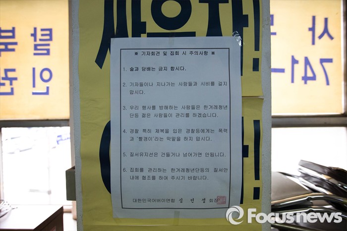 (서울=포커스뉴스) 22일 오전 서울 종로구에 위치한 어버이연합 사무실에 기자회견 및 집회 시 유의사항이 적힌 인쇄물이 붙어 있다. 전경련에서 자금지원을 받은 의혹으로 논란에 휩싸인 어버이연합은 이날 기자회견을 열고 언론에 보도된 어버이연합 관련 기사들에 반박했다.