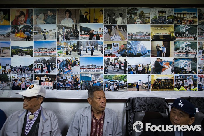 (서울=포커스뉴스) 22일 오전 서울 종로구에 위치한 어버이연합 사무실에서 관계자들이 앉아 있다. 전경련에서 자금지원을 받은 의혹으로 논란에 휩싸인 어버이연합은 이날 기자회견을 열고 언론에 보도된 어버이연합 관련 기사들에 반박했다.