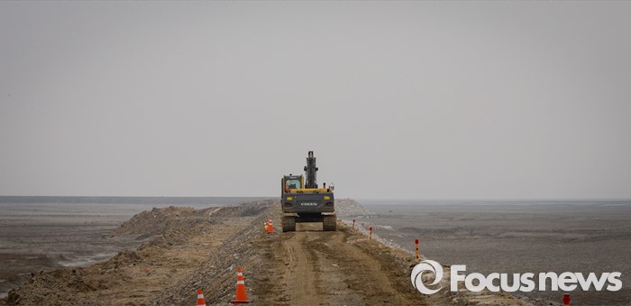 (인천=포커스뉴스) 마흔 여섯번째 지구의 날을 맞은 22일 오전 경기 인천시 영종도 갯벌매립공사장 뚝방길로 포크레인이 지나가고 있다. 지구의 허파로 불리는 갯벌은 생태계 면적의 0.3%에 불과하지만 자연의 정화조로서 생태적 가치는 숲의 10배, 농경지의 100배에 달한다. 간척과 매립 등 인간의 욕심으로 서서히 사라져가는 갯벌, 어머니 지구의 준엄한 경고를 새겨들을 때이다.