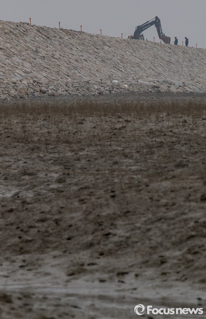 (인천=포커스뉴스) 마흔 여섯번째 지구의 날을 맞은 22일 오전 경기 인천시 영종도 갯벌에 매립공사가 진행되고 있다. 지구의 허파로 불리는 갯벌은 생태계 면적의 0.3%에 불과하지만 자연의 정화조로서 생태적 가치는 숲의 10배, 농경지의 100배에 달한다. 간척과 매립 등 인간의 욕심으로 서서히 사라져가는 갯벌, 어머니 지구의 준엄한 경고를 새겨들을 때이다.