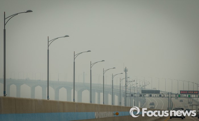(인천=포커스뉴스) 몽골과 중국 북부에서 발생한 황사가 서해안으로 유입된 22일 오후 인천대교가 황사와 안개로 흐릿하게 보이고 있다.