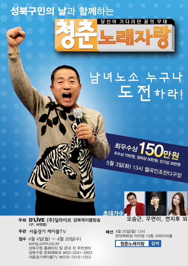 딜라이브 지역채널을 담당하는 서울경기케이블TV는 본선무대를 녹화해 오는 5월 14일 오전 11시 30분 채널 1번을 통해 방송할 예정이다.청춘 노래자랑 서울 성북구편 포스터.<사진제공=딜라이브>