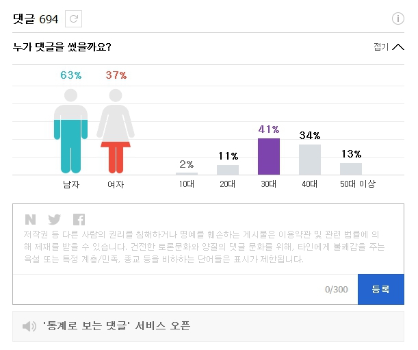 (서울=포커스뉴스) 네이버 뉴스가 각 기사별로 이용자들의 성별 및 연령대에 따른 댓글 비율을 그래프로 보여주는 '통계로 보는 댓글' 서비스를 시작한다고 22일 밝혔다.