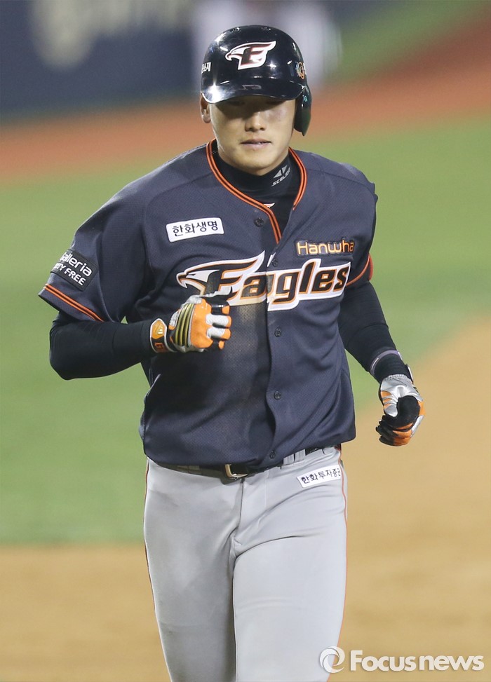 (서울=포커스뉴스) 22일 서울 잠실구장에서 열린 2016 프로야구 한화-두산 경기 9회초 한화 신성현이 좌월 솔로 홈런을 치고 홈인하고 있다.