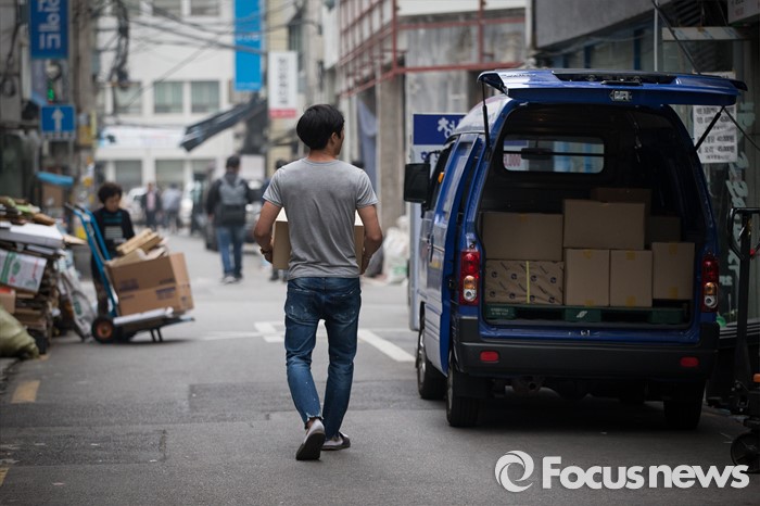 (서울=포커스뉴스) 세계 책의 날을 하루 앞둔 22일 오후 서울 중구 충무로 인쇄골목에서 한 인쇄업자가 완성된 책을 나르고 있다.