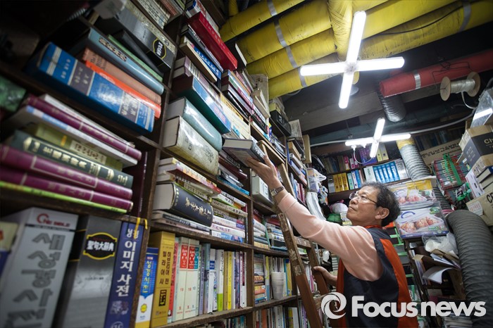 (서울=포커스뉴스) 세계 책의 날인 23일 오전 서울 중구 청계6가 평화시장 헌책방 골목 기독성문서적에서 현만수 평화시장 서점 연합회 회장이 책을 정리하고 있다. 청계 6가 헌책방거리는 1970년대 점포수가 200여 개에 달할 정도로 성황이었지만 현재는 25곳 정도 밖에 남아 있지 않다.