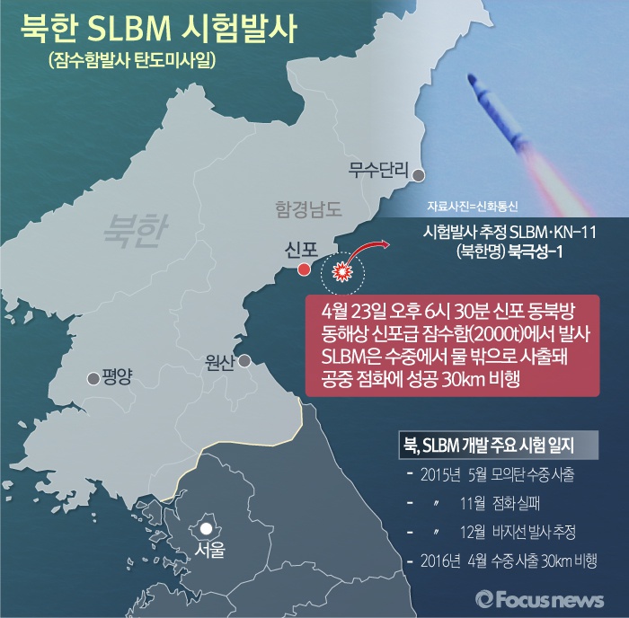 (서울=포커스뉴스) 북한이 23일 오후 6시 30분쯤 신포 동북방 동해상에서 잠수함발사 탄도미사일(SLBM) 발사시험을 한 것으로 파악됐다. 합동참모본부는 이날 "북한이 발사한 SLBM 추정 발사체 1발이 수 분 동안 30km를 날아간 것으로 분석됐다"고 밝혔다.