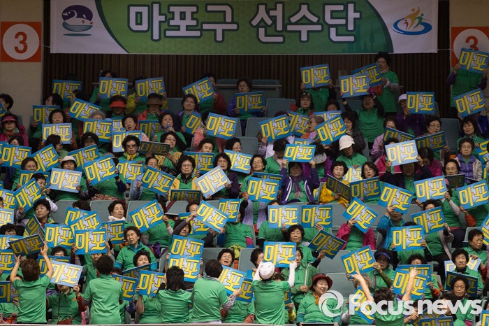 (서울=포커스뉴스) 24일 오전 서울 송파구 잠실실내체육관에서 열린 '2016 서울시민 생활체육대회'에서 참가자들이 열띤 응원을 펼치고 있다.