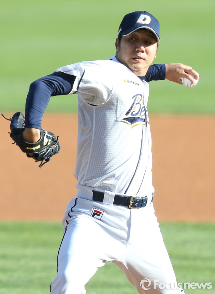 (서울=포커스뉴스) 24일 서울 잠실구장에서 열린 2016 프로야구 한화-두산 경기에서 1회초 두산 선발투수 장원준이 투구하고 있다.