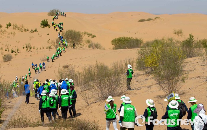 (다라더치/중국=포커스뉴스) 24일 오전 중국 내몽고 다라더치 쿠부치사막에서 한ㆍ중ㆍ일 대학생들로 구성된 2016 미래숲 15기 녹색봉사단원들이 사막트래킹을 하고 있다. 미래숲 녹색봉사단은 이번 봉사활동을 통해 황폐화된 사막에 나무 심기 및 각국 청년들과 우호를 증진을 위한 교류 활동을 전개할 예정이다.