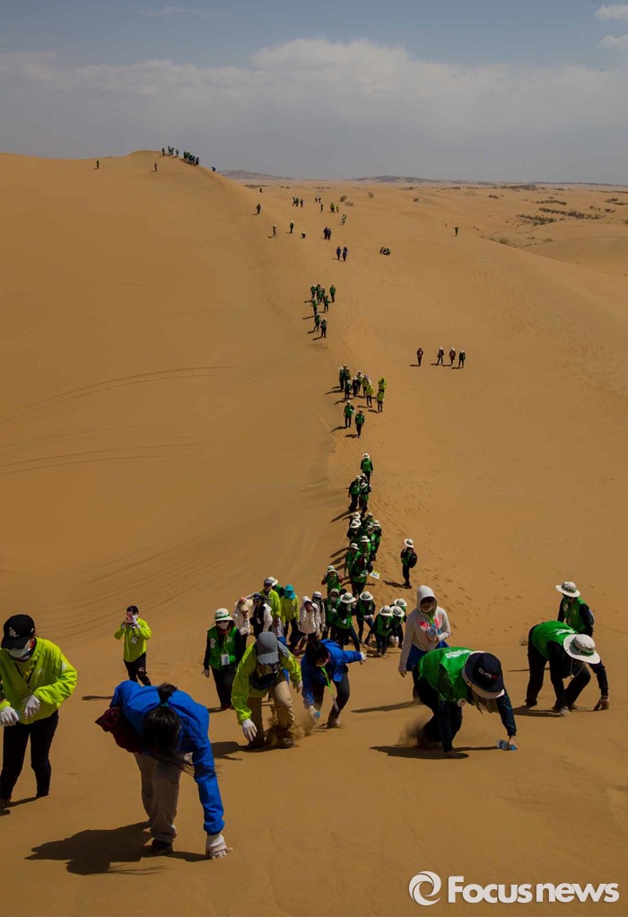 (다라더치/중국=포커스뉴스) 24일 오전 중국 내몽고 다라더치 쿠부치사막에서 한ㆍ중ㆍ일 대학생들로 구성된 2016 미래숲 15기 녹색봉사단원들이 사막트래킹을 하고 있다. 미래숲 녹색봉사단은 이번 봉사활동을 통해 황폐화된 사막에 나무 심기 및 각국 청년들과 우호를 증진을 위한 교류 활동을 전개할 예정이다.
