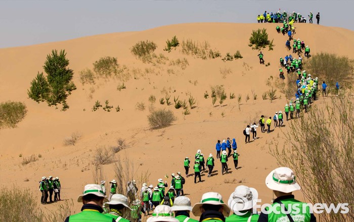 (다라더치/중국=포커스뉴스) 24일 오전 중국 내몽고 다라더치 쿠부치사막에서 한ㆍ중ㆍ일 대학생들로 구성된 2016 미래숲 15기 녹색봉사단원들이 사막트래킹을 하고 있다. 미래숲 녹색봉사단은 이번 봉사활동을 통해 황폐화된 사막에 나무 심기 및 각국 청년들과 우호를 증진을 위한 교류 활동을 전개할 예정이다.