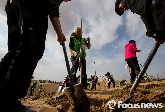 (다라더치/중국=포커스뉴스) 24일 오후 중국 내몽고 다라더치 쿠부치사막에서 권병현 미래숲 대표가 나무심기작업을 하고 있다. 미래숲 녹색봉사단은 이번 봉사활동을 통해 황폐화된 사막에 나무 심기 및 각국 청년들과 우호를 증진을 위한 교류 활동을 전개할 예정이다.