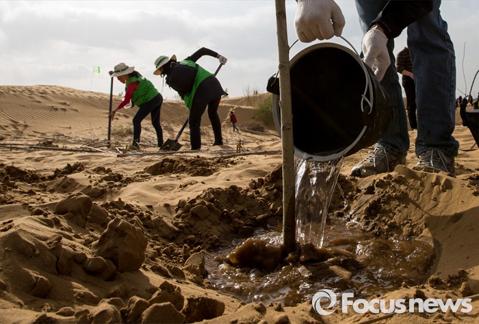 (다라더치/중국=포커스뉴스) 24일 오후 중국 내몽고 다라더치 쿠부치사막에서 2016 미래숲 15기 녹색봉사단 후원사 회원들이 나무심기작업을 하고 있다. 미래숲 녹색봉사단은 이번 봉사활동을 통해 황폐화된 사막에 나무 심기 및 각국 청년들과 우호를 증진을 위한 교류 활동을 전개할 예정이다.