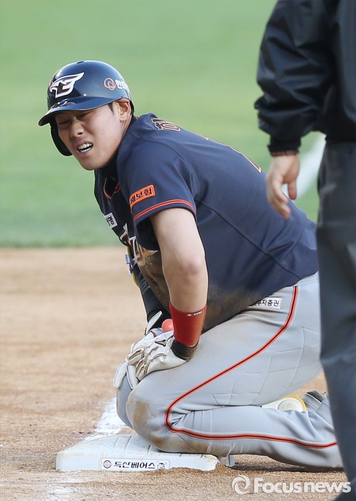(서울=포커스뉴스) 24일 서울 잠실구장에서 열린 2016 프로야구 한화-두산 경기 5회초 2사후 한화 하주석이 좌중간 2타를 치고 중계플레이 실책에 3루까지 진루한후 베이스에 무릎을 꿇고 숨을 고르고 있다.