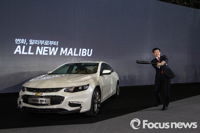 (서울=포커스뉴스) 27일 오전 서울 구로구 고척스카이돔에서 열린 한국지엠 '올 뉴 말리부' 신차 발표회에서 제임스 김 한국지엠 사장이 신차 발표를 축하하며 취재진을 향해 포즈를 취하고 있다.