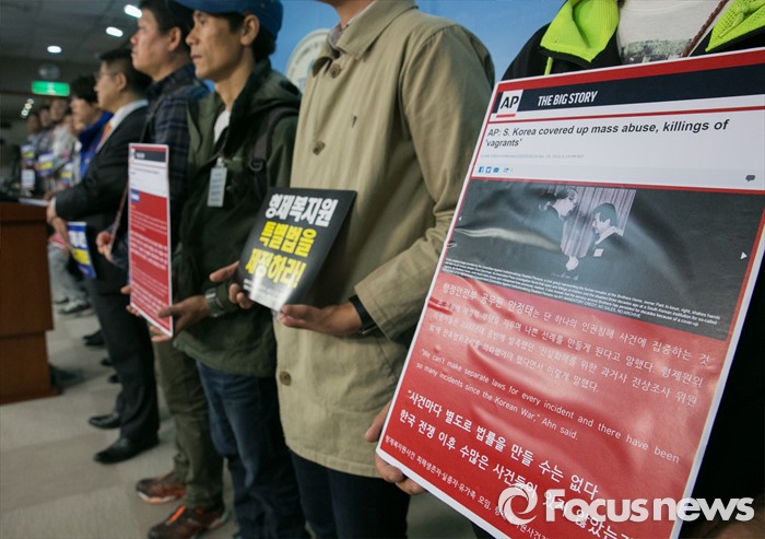 (서울=포커스뉴스) 진선미 더불어민주당 의원과 형제복지원 사건 피해생존자, 실종자, 유가족모임 등이 27일 오전 서울 여의도 국회 정론관에서 형제복지원 특별법 제정 촉구 기자회견을 하고 있다.