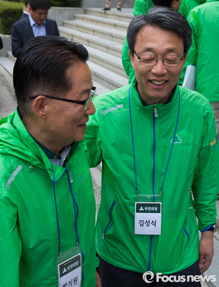 (양평=포커스뉴스) 국민의당 20대 총선 당선인 워크숍에서 합의 추대된 박지원(왼쪽) 원내대표와 김성식 정책위의장이 27일 오전 경기도 양평 한화리조트에서 선언문 낭독 후 대화를 나누고 있다.
