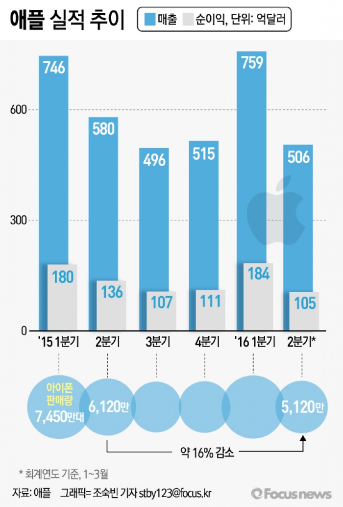 아이폰 판매량은 5120만대로 전년 동분기 판매량 6120만대에 비해 16% 줄어들었다.