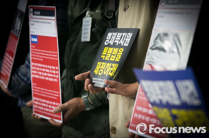 (서울=포커스뉴스) 진선미 더불어민주당 의원과 형제복지원 사건 피해생존자, 실종자, 유가족모임 등이 27일 오전 서울 여의도 국회 정론관에서 형제복지원 특별법 제정 촉구 기자회견을 하고 있다.