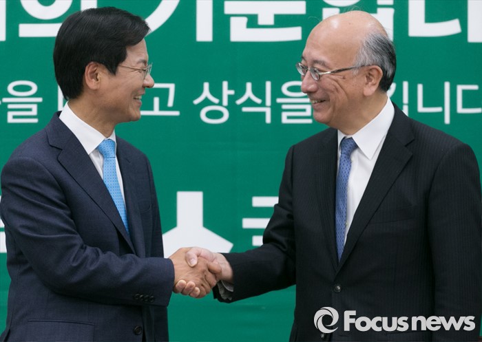 (서울=포커스뉴스) 천정배(왼쪽) 국민의당 공동대표가 29일 오후 서울 여의도 국회를 방문한 벳쇼 코로 주한일본대사와 악수를 하며 취재진을 향해 포즈를 취하고 있다.