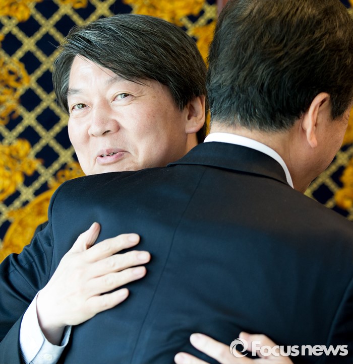 (서울=포커스뉴스) 안철수 국민의당 상임공동대표가 25일 오후 서울 영등포구의 한 중식당에서 제20대 국회의원 선거 서울지역 출마자들과 오찬간담회에 앞서 포옹을 하고 있다.