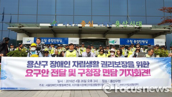 이들 단체는 △장애인활동지원 구비추가지원 확대 △탈시설장애인을 위한 용산구 관내 자립생활주택 마련 및 운영지원 △장애인자립생활센터 운영 지원 확대 △발달장애인 평생교육기관 유치 △용산구 장애인 인권영화제 개최 및 지원 등 5가지 조항을 요구했다.