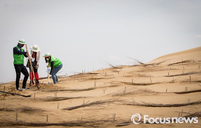 (다라더치/중국=포커스뉴스) 25일 오후 중국 내몽고 다라더치 쿠부치사막에서 2016 미래숲 15기 녹색봉사단원들이 나무 심기 작업을 하고 있다. 미래숲 녹색봉사단은 이번 봉사활동을 통해 황폐화된 사막에 나무 심기 및 각국 청년들과 우호를 증진을 위한 교류 활동을 전개했다.