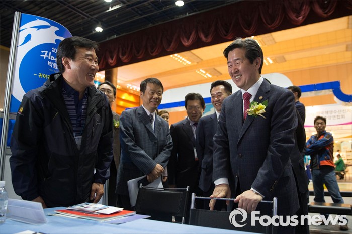 (서울=포커스뉴스) 28일 오전 서울 삼성동 코엑스에서 열린 2016 귀어귀촌 박람회장을 찾은 윤학배 해양수산부 차관이 관계자들을 만나 대화를 나누고 있다.