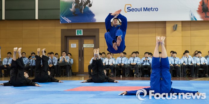 (서울=포커스뉴스) 28일 오후 서울 성동구 서울메트로 인재개발원에서 열린 지하철보안관 무술 경연 대회에서 서울메트로 소속 지하철보안관들이 낙법 시범을 선보이고 있다.