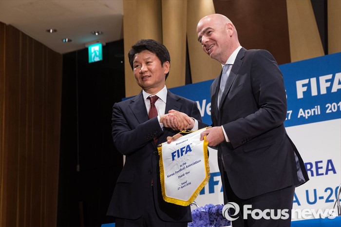 (서울=포커스뉴스) 한국을 방문한 지아니 인판티노(46, 스위스) FIFA 회장이 27일 오후 서울 강남구 아이파크타워에서 열린 기자회견에 참석, 정몽규 대한축구협회장과 페넌트 교환을 하고 있다.