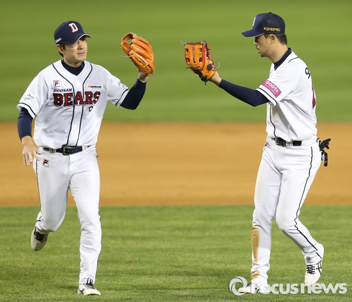 (서울=포커스뉴스) 28일 서울 잠실구장에서 열린 2016 프로야구 SK-두산 경기 8회초 1사 1,2루에서 SK 이재원의 유격수앞 땅볼때 두산 유격수 김재호(왼쪽)와 2루수 오재원이 더블플레이를 성공하고 글로브를 마주치고 있다.