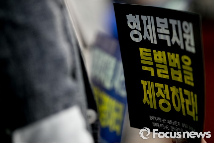 (서울=포커스뉴스) 진선미 더불어민주당 의원과 형제복지원 사건 피해생존자, 실종자, 유가족모임 등이 27일 오전 서울 여의도 국회 정론관에서 형제복지원 특별법 제정 촉구 기자회견을 하고 있다.