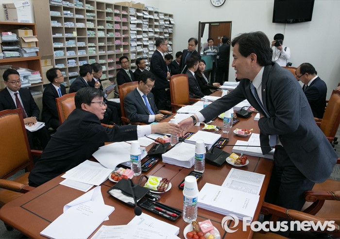 (서울=포커스뉴스) 26일 오전 서울 여의도 국회에서 열린 법제사법위원회 법안심사1소위원회에 참석한 전해철(왼쪽) 야당 간사와 김진태 새누리당 의원이 악수하고 있다.