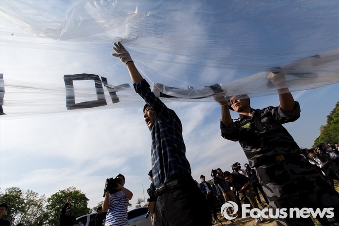 (파주=포커스뉴스) 29일 오후 경기 파주 낙하IC 인근에서 탈북자단체인 자유북한운동연합이 북한에 핵과 미사일을 포기하고 국제사회 일원으로 참여할 것을 촉구하는 내용의 대북전단을 날려보내기 위해 수소가스를 주입하고 있다.